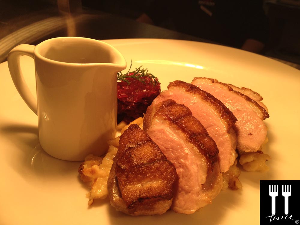 [LEFT] SLOW ROASTED DUCK BREAST with SPATZLE, RED CABBAGE & PORT WINE GLAZE
