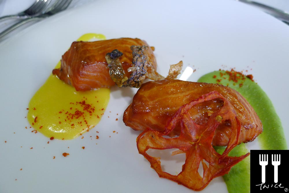 [LEFT] ENTRÉE: HOT SMOKED TASMANIAN SALMON with PEA PUREE