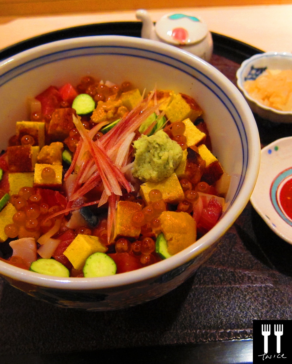 Mazechirashi (Sushi rice topped with mixed sashimi) – The chirashi was the best I ever had! The amount of sashimi is overwhelming (imagine – sashimi 2/3, rice 1/3) – I spied the chef piling on chunks of tuna, aji, swordfish, ikura, uni, tai, toro etc. He then generously topped it with tamago squares, crunchy Japanese cucumber, shredded mayoga (ginger flower) & a dollop of freshly grated wasabi. Each mouthful was exploding with its exquisite flavors.