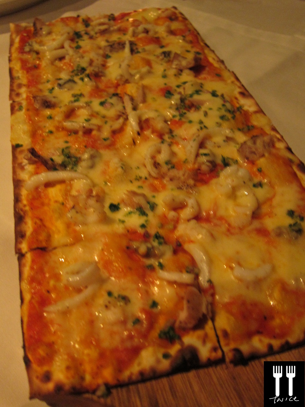 [Left] THE ABACA ORIGINAL FLATBREAD PIZZA (Marinara seafood with gremolato) – Thin crust pizza with fresh toppings is always a winner.