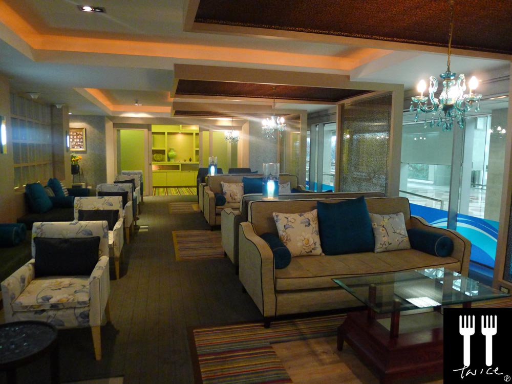 Interior of the business class lounge – very cosy, mediterranean-themed and equipped with hot food and internet (no shower or toilets in the lounge)