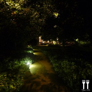 You have to walk through a narrow path to reach the beautiful colonial building.