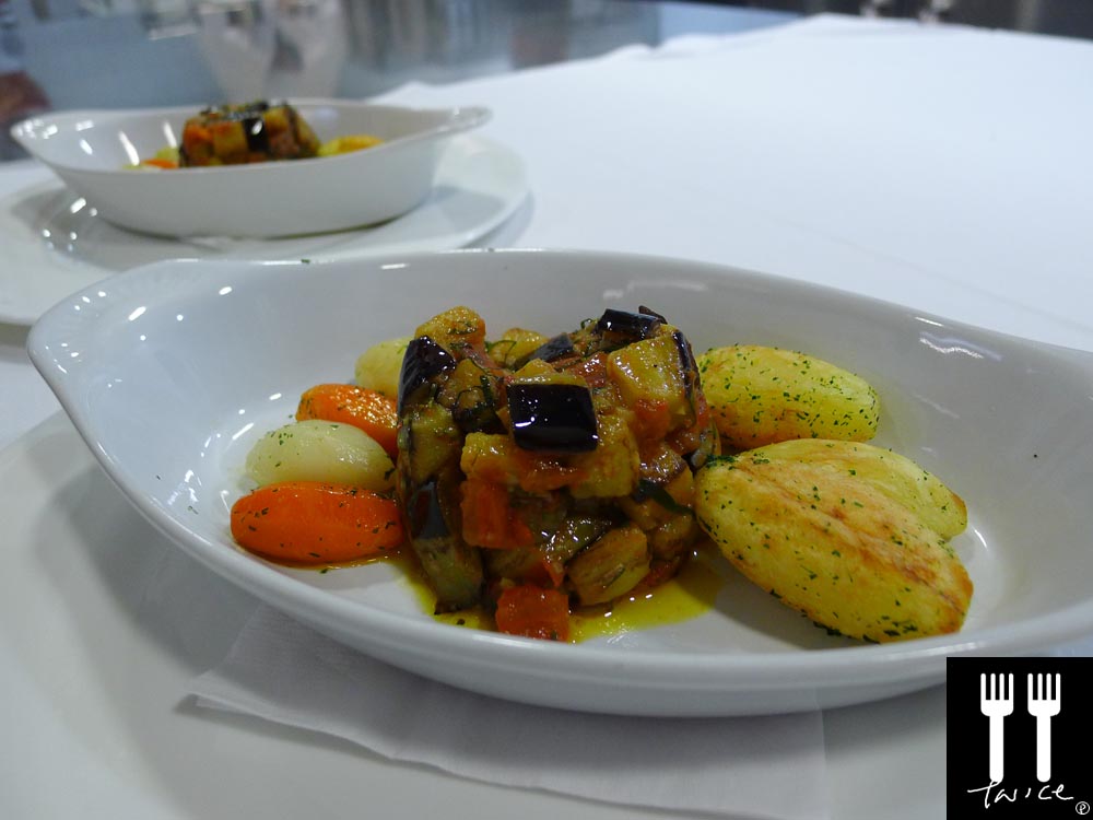 This is what we did last saturday (which was also the first time we plated and served up for grading) – Eggplant and Tomato stew served with turned vegetables. Turning was such a pain!!!
