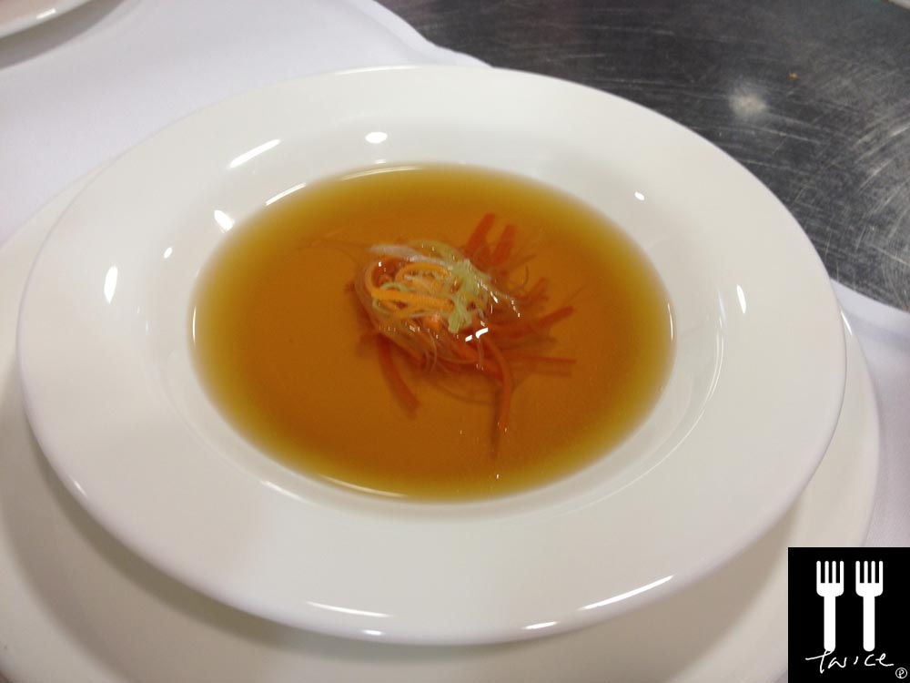 [LEFT] BEEF CONSOMME (by Chef Mark) – Finally, I get to make a consomme on my own! Very interesting but requires good technique for sure. One thing I still struggle with is how to skim the consomme such that the soup is entirely grease-free. Maybe the solution is to buy a pot with a tap at the bottom.