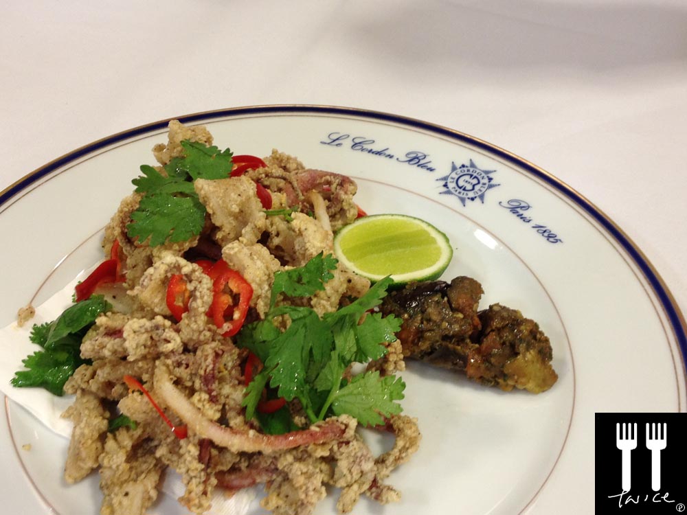 [LEFT] SALT & PEPPER SQUID served with Eggplant & Tomato Relish (by Chef Darren) – Deep fried Sotong (Malay term for squid) is everyone’s favorite, of course! This dish is definitely a good party food. I enjoyed learning how to fillet the sotong and how to remove the ink ‘pouch’ from the sotong which we can retain for making pasta/sauces :)!
