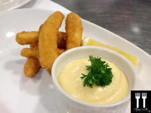 [LEFT] GOUJONS OF FLATHEAD served with Mayonnaise (by Chef Mark) – These golden crispy fish fingers are awesome but who would spend all the time filleting, crumbing then frying it unless the effort can be justified! Frozen fish fingers to the rescue?? 😛
