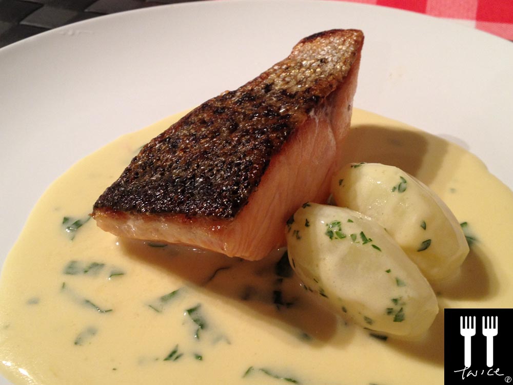 [RIGHT] PAN FRIED SALMON SUPREME with a Sorrel Cream Sauce (by Me) – A very simple and beautiful dish. Love the crispiness of the salmon skin and how the sauce compliments the fish so well.