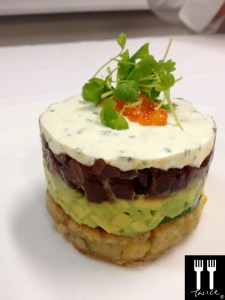 [LEFT] TUNE TARTARE with Avocado, Corn Blini & Wasabi Creme Fraiche (by Me) – What a PRETTY looking stack this is…I love the color and texture contrast involved in this dish. Unfortunately, I did not quite cook my blini enough so it was alittle raw inside.