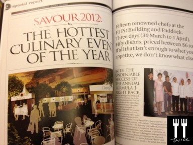 Savour is a huge culinary carnival showcasing many celebrity chefs. The chefs will present 3 – 4 of their signature dishes to the audience – Kinda like a “Michelin-starred” Pasar Malam (Night Market in Malay language)”. See the official Savour menu.