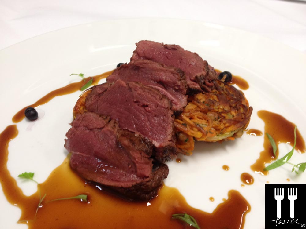 [LEFT] ROAST FILLET OF KANGAROO with pepperberry sauce served with KUMERA GALETTE with pine nuts (by Me) – my first attempt at kangaroo turned out rather successful. The key is to cook it to medium rare so it doesn’t taste too tough/rubbery. Having said that, I do not quite enjoy the ‘special taste’ of kangaroos. [DO YOU KNOW? Kangaroos are considered as pests in OZ – simply too many of them!].