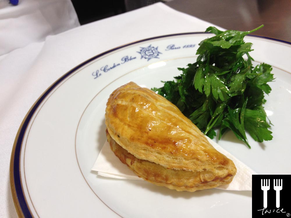[LEFT] MUSHROOM CHAUSSONS (by Chef Darren) – The puff pastry was created from scratch which we worked on over a span of 3 lessons (the pastry needs to be turned up to 6 times with intervals of 20-30min in between). Tough job! I certainly wouldn’t think twice about purchasing puff pastry off the shelf or better still, purchase from a bakery that sells handmade puff pastry 🙂