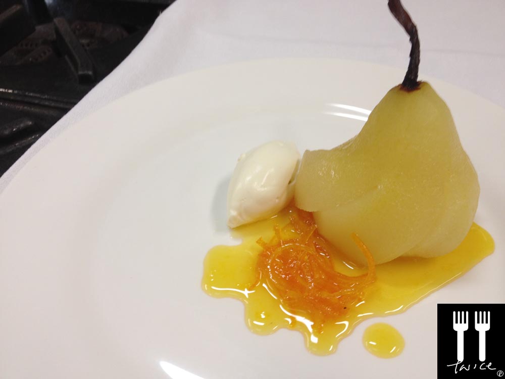 [RIGHT] POACHED PEAR with orange glaze (by Me) – A very delightful and refreshing dessert which overthrew my dislike towards william pears. As for the quenelle…just as I thought I was getting it – Chef Darren pointed out that I require more practice 😦