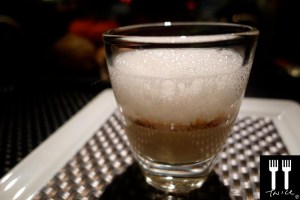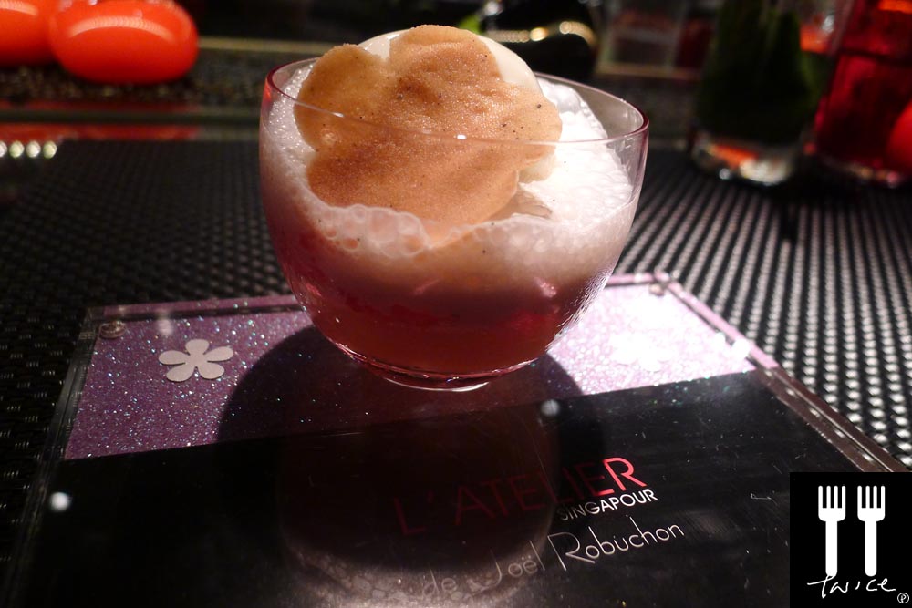 [LEFT] FOIE GRAS CUSTARD WITH RED PORTO WINE AND PARMESAN FOAM