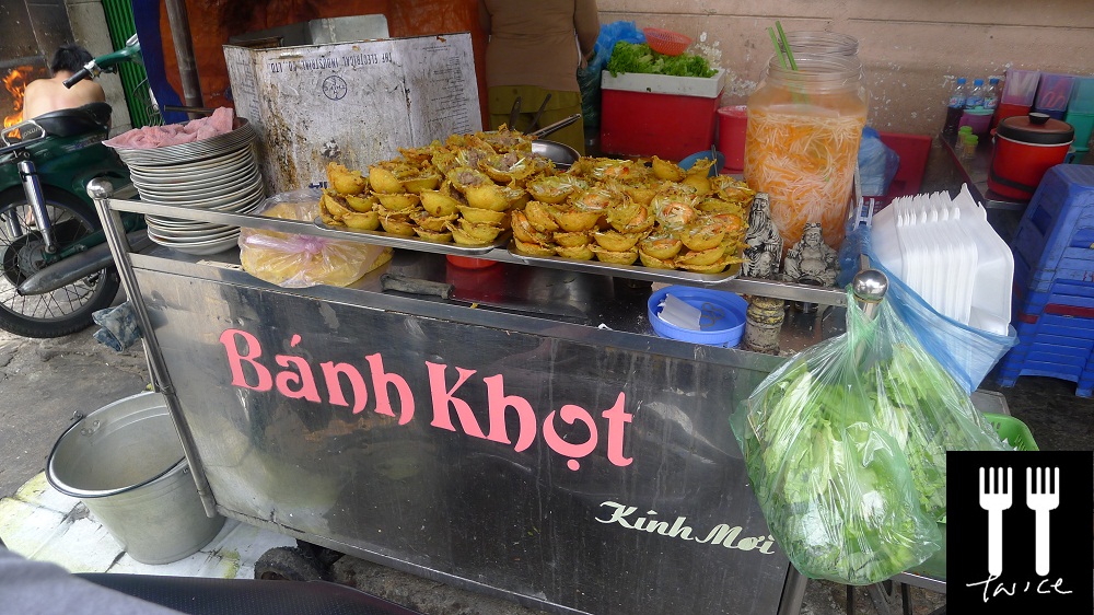 The best banh khot I had in Saigon was at this street vendor based at the corner of Tue Tinh Street and Cong Chua Ngoc Han Street in district 11. This humble stall is owned by two camera shy Vietnamese ladies who dish out hundreds of these tasty little treats everyday at the roadside with only 3-4 small tables .
