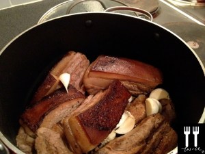 [LEFT] Seared pork belly ready to plunge into braising liquid to be braised for ~2 hours (I insisted on the oven while my mom insisted on the stove – she won. I still disagree :p)