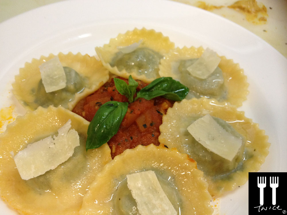 [LEFT] RAVIOLI FILLED WITH SPINACH and FETA with TOMATO and BASIL SAUCE (by Me) – Can’t wait to make egg yolk ravioli at home, soon!