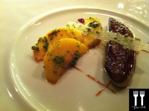[RIGHT] Seared Duck Foie Gras with Roasted Peaches and Pistachio. This was served together with Robuchon’s signature mashed potatoes. – Easily the best foie gras i ever had! This dish would score a perfect 10 if only the roasted peaches were a little sweeter.