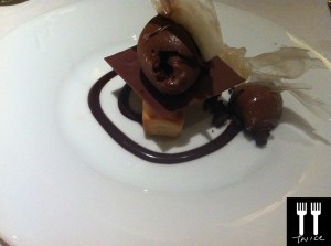 [RIGHT] Textures of Chocolate – The dark chocolate dessert was awesome! The pairing dessert wine (with notes of dry raisins & dates) augmented the overall flavour of this signature dessert.