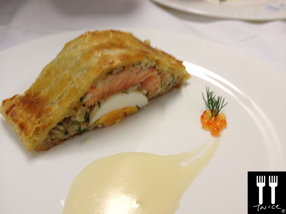 [RIGHT] A slice of my coulibiac presented in a more sophisticated manner with dill sauce and roe.