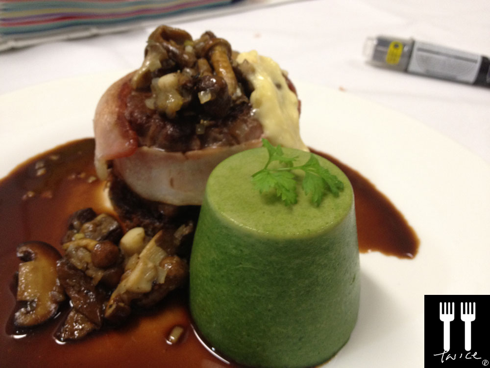 [LEFT] Fillet Mignon with Red Wine Jus, Spinach Timbale, Potato Galette, Wild Mushrooms and Truffle Mayonnaise (by Me) – as much as I love anything truffle, the truffle mayo was simply out of place! The spinach timbale turned out to be one of our exam component in Superior Cuisine Practical Exam.