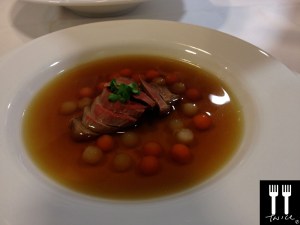 [LEFT] Game Consommé with Poached Breast of Pigeon and Solferino Garnish (by Chef Ross)