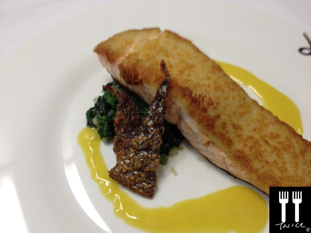 [RIGHT] Pan-Fried Fillet of Salmon with Potato Crust, Wilted Asian Greens and Wasabi Beurre Blanc (by Me)