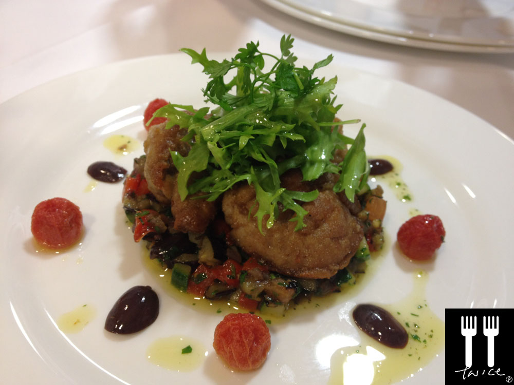 [LEFT] Veal Sweetbreads with Herb Salad and Caponata Dressing (by Chef Ross) – fancy meat is clearly not my cup of tea. But well, I will choose sweetbreads over brain, any day.