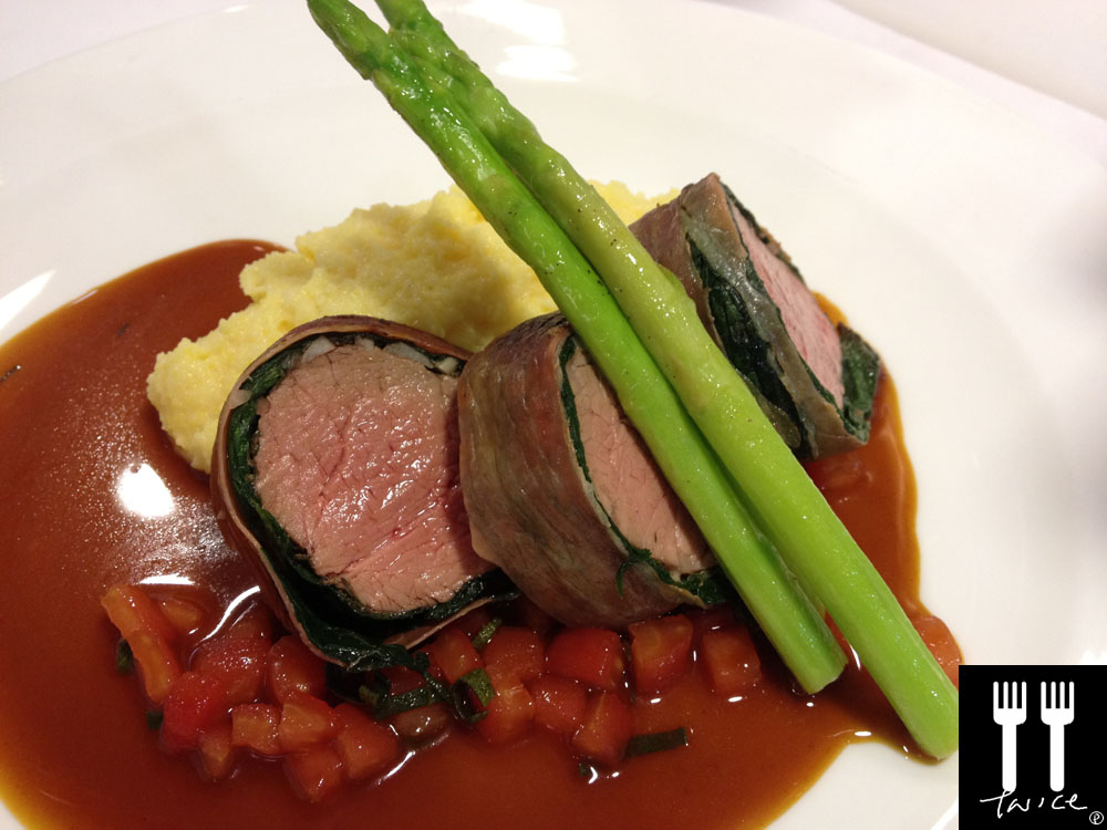 [RIGHT] Roast Veal Fillet Wrapped in Spinach and Prosciutto with Sage and Tomato Jus and Soft Polenta (by Chef Josef)