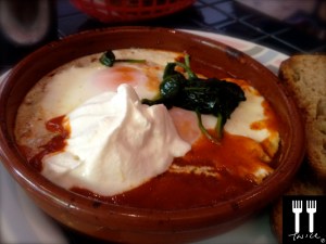 [LEFT] SOFT BAKED EGGS ($16) – Poached Eggs, Goats Curd, Wilted Spinach & Ranchero Sauce & Rye Sourdough. A hearty and well executed dish for eggs-lover (like my friend, M).